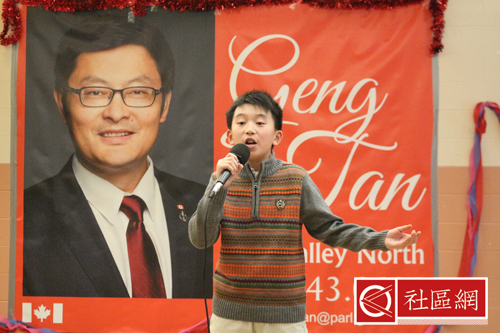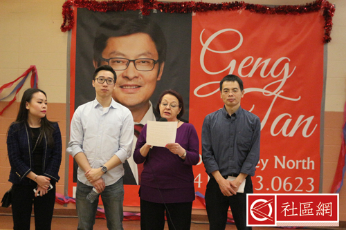 嘉宾都是熟悉的面孔,也就是该区或邻区政治人物或教育委员。他们分别是Don Valley West联邦国会议员Rob Oliphant,Don Valley East市议员Shelley Caroll和Don Valley East TDSB教育委员Ken Lister等,其中Shelley Caroll还在现场摆出摊位,为选民服务。国会议员陈圣源办公室也到场支持,同庆春节。谭耕办公室负责人Janet 率所有人员与大家亮相,并向选民呼吁,假若大家需要得到谭耕的帮助,请尽可能前往办公室,他们非常乐意为大家服务。Janet特意指出,谭耕办公室免费为低收入和耆老提供专业报税服务。