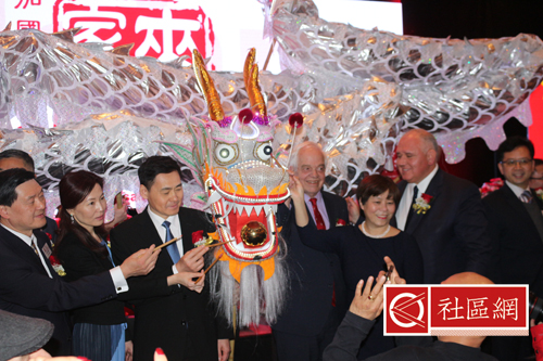 加、中国歌高奏之后,主办方安排了富有中华传统的舞龙与醒狮仪式。主持人邀请陈国治厅长介绍当晚嘉宾,可以说是加拿大三级政府都有代表到场,大部分是现任政治人物,也包括个别曾经担任政治人物的嘉宾。一大批侨领也莅临现场,当然就没有一一列举。不过最引人注目的一位嘉宾,就是麦家廉的母亲,92岁高龄,也来到了现场,掌声久久不绝。