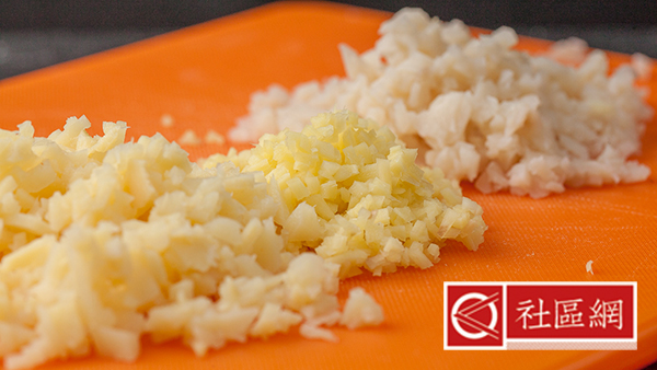 锅里放油,放入姜末蒜末爆香,下一磅鸡肉碎,半磅猪肉碎炒香,倒掉多余的油。加入香菇、马蹄、竹笋小粒。