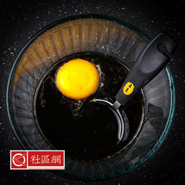 用蚝油、生抽、老抽、麻油、胡椒、鸡蛋、糖和生粉调成汁,到入锅中。