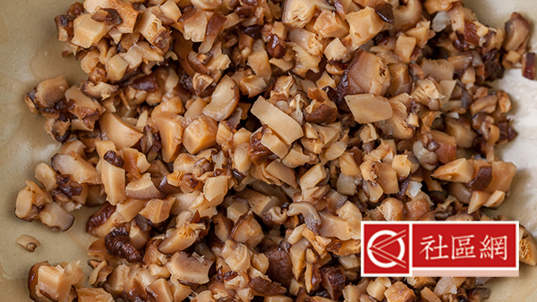 把泡好的香菇、马蹄、竹笋切成小粒。