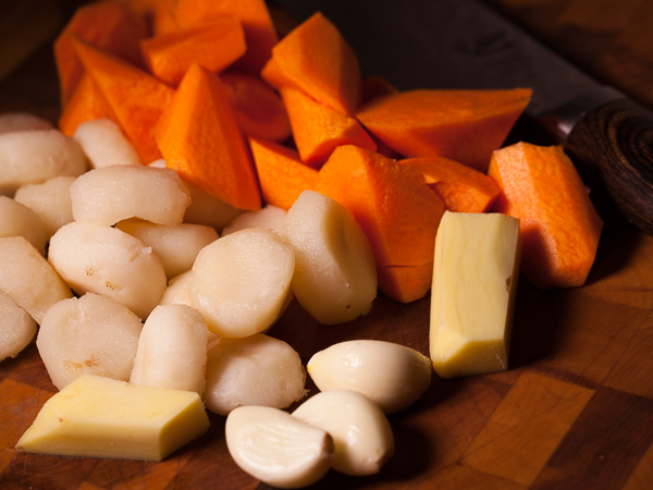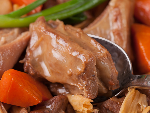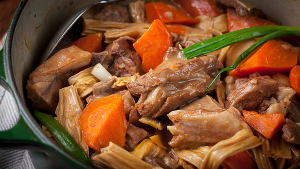 羊腩用开水炖一个钟,姜片蒜片爆香,加南乳、葱段、蚝油、生抽、羊腩爆炒,加绍酒小火焖30分钟,再加马蹄、红萝卜、白胡椒、陈皮、芝麻酱、花生酱、支竹和高汤焖30分钟。