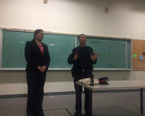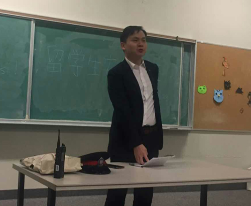 在宋领事的安全教育报告之后,多伦多华裔警官杨先生结合多年处置治安案件经验,对留学生可能遇到的各种危险情况,做了更细致生动的讲解。杨警官的介绍包括从衣食住行各个方面,特别是交通安全,尤其是酒驾的危害性。杨警官与现场听众互动良好,增强了大家的体验。