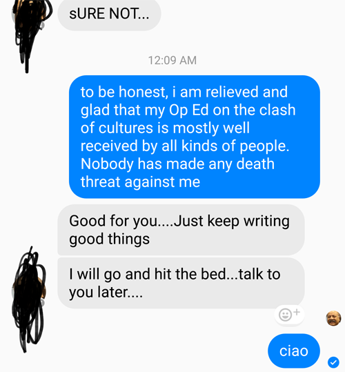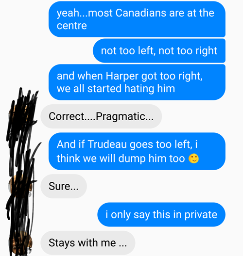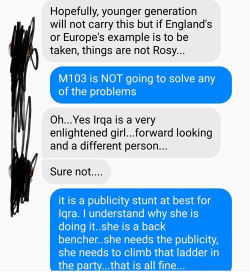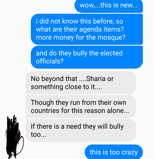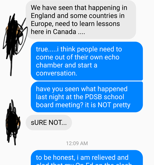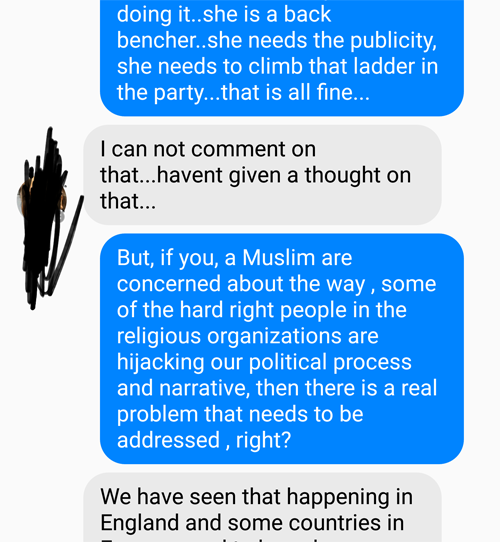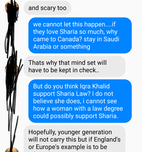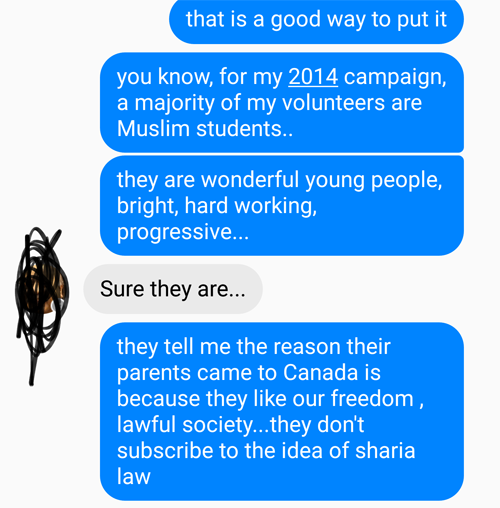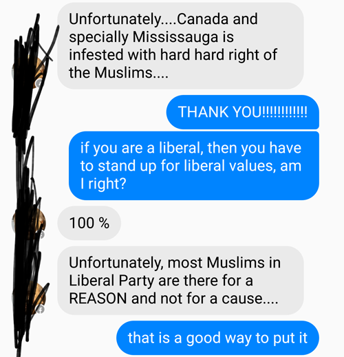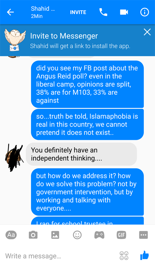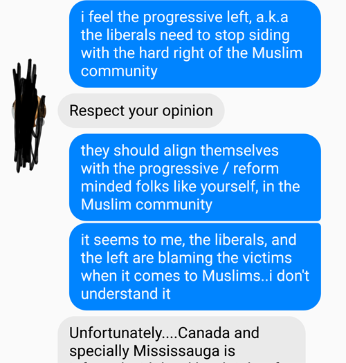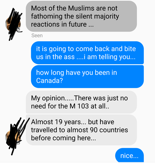 M-103议案过了以后, 笔者跟Mississauga(密市)一位穆斯林社区领袖的对话。为个人安全和隐私起见,笔者将其头像做了涂鸦处理,相信大家会理解。假若您英文过得去,能够耐着性子看完整段对话的话,下面几大看点估计会引起您注意: