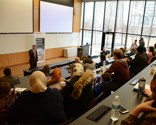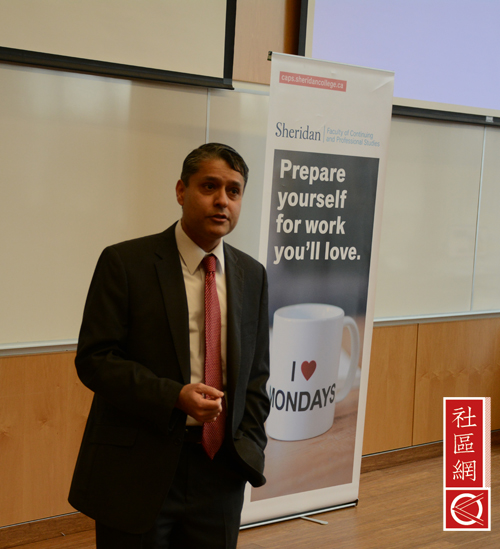 3月25日,一个阴雨绵绵的周六,Sheridan成人与职业教育学院(Faculty of Continuing and Professional Studies,简称成职学院)在Mississauga校园举办社区信息日活动。据市场公关负责人Hayder Sultan介绍,该次活动准备有些仓促,但没有想到现场来了这么多人参与。这是记者第二次参加类似的活动,从先后两次感受看,受欢迎的原因应该是现场介绍,干货多多!非常遗憾的是,来自华人社区的听众十分有限!