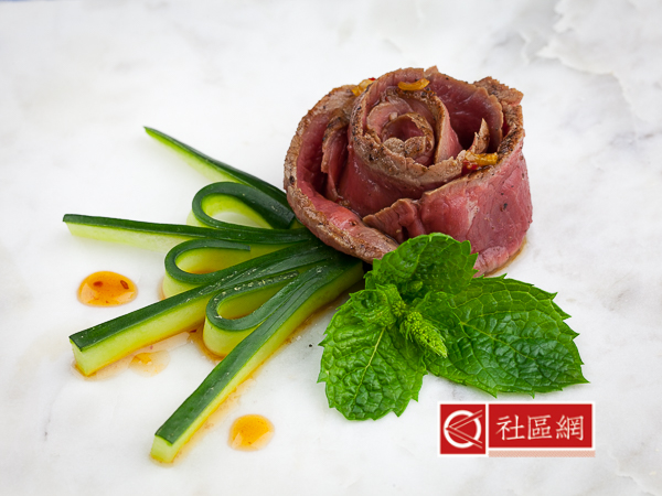 醒好的牛扒切片,加黄瓜片,撒上焦薄荷叶和新鲜薄荷,淋上酱汁,吃!