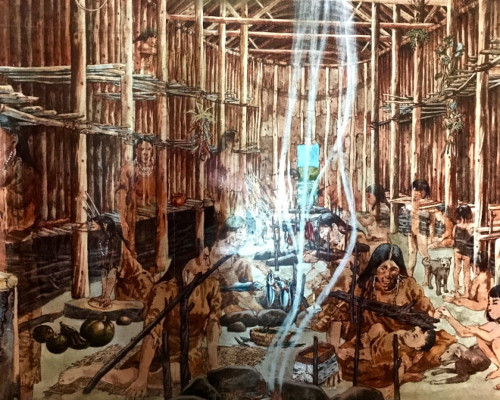 此湖面积为232公顷,环湖周长1.2公里建有木栅栏游道,禁止游泳和垂钓,整个区域为保护区。这里早已没有原住民,1973年考古才发现这片遗址,当时经探测发现湖底有玉米花粉,玉米是传播不远的。果然,在离湖几百米外的平地上发现了500年前印第安人的部落遗址,发掘出11座大屋、1万多件文物,曾经是300多人居住的地方。现按原样复原了三座大屋供游人了解原住民的习俗,2014年起对外开放。